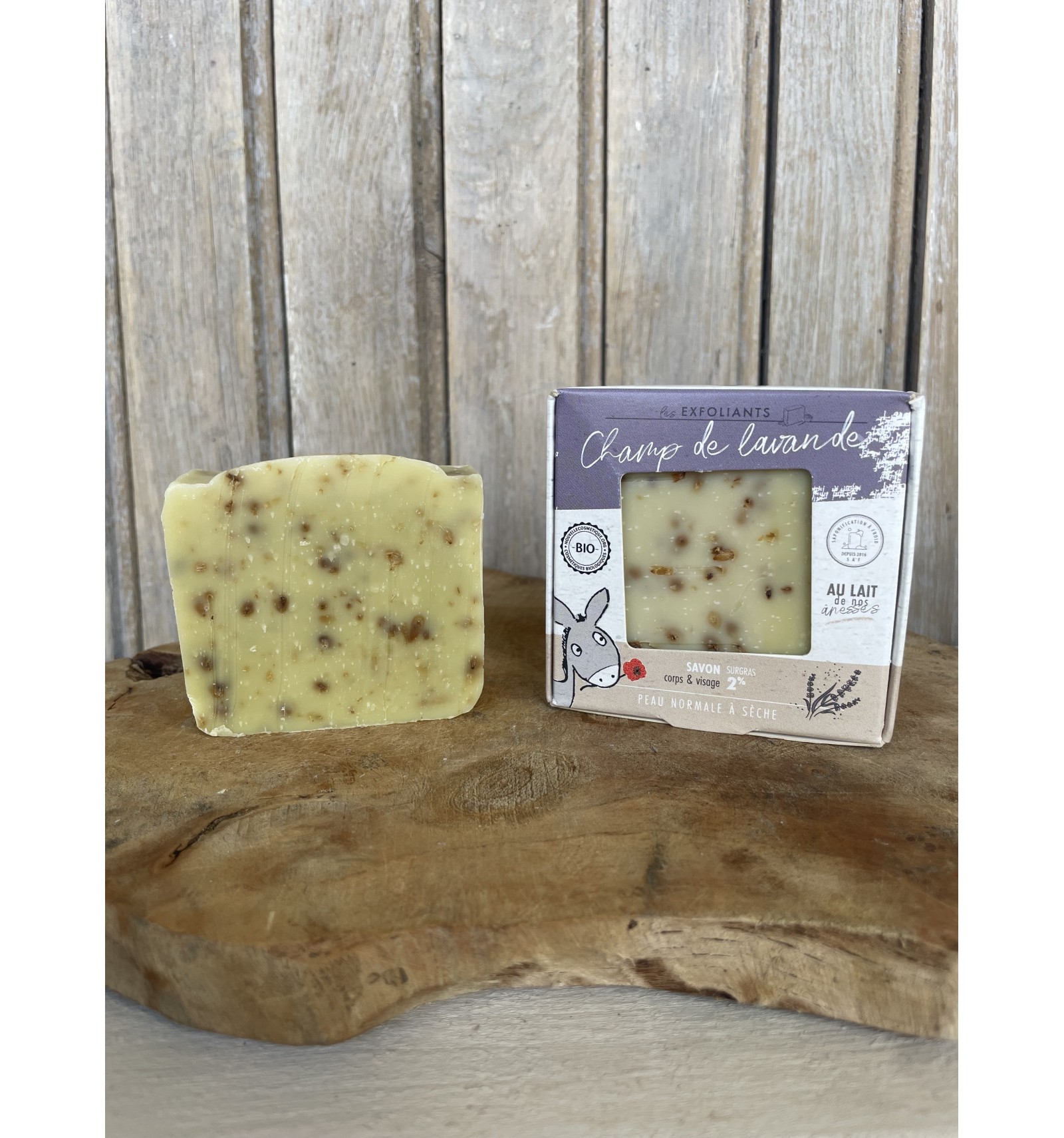 Ing : huile d'olive*, huile de coco*, lait d'ânesse, huile d'avocat*, huile de chanvre*, huile essentielle de lavandin*, fleurs de lavande*.